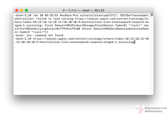 • インストーラが参照している カタログURL (https://swscan.apple.com/…sucatalog) をログで特定し、