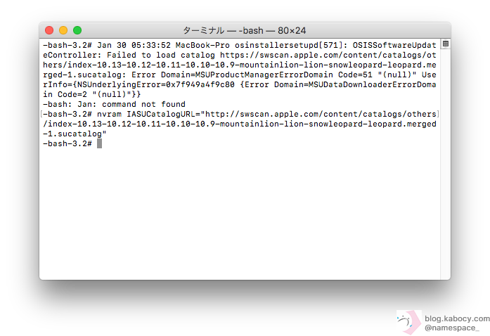 • macOS のターミナルの場合: sudo nvram -d IASUCatalogURL
