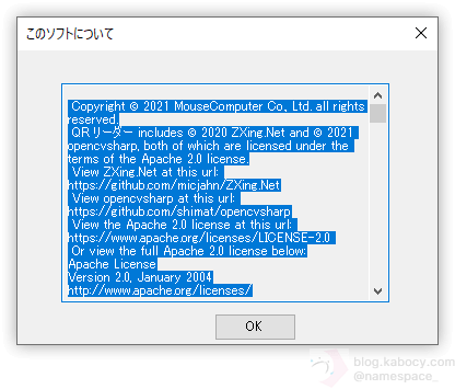 ▼ なお、mouse E10にインストールされていた「QR リーダー」はマウスコンピューターが開発したもので、ライブラリにはZXing.Netが使用されているようです。
