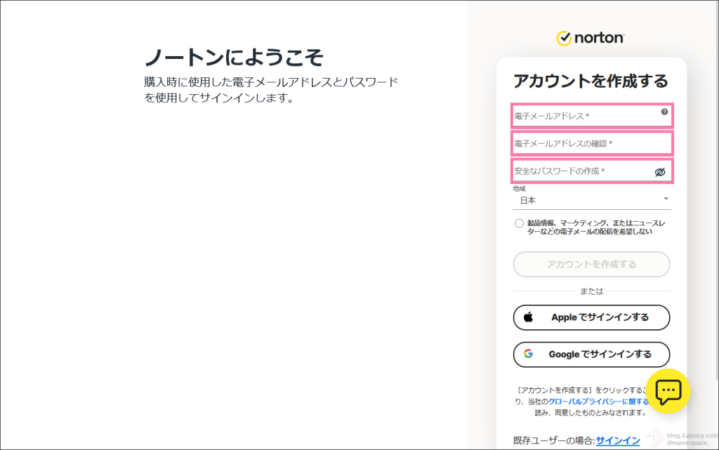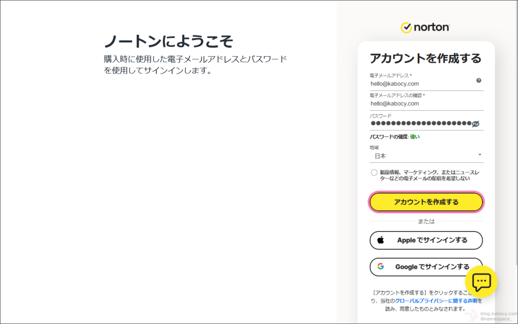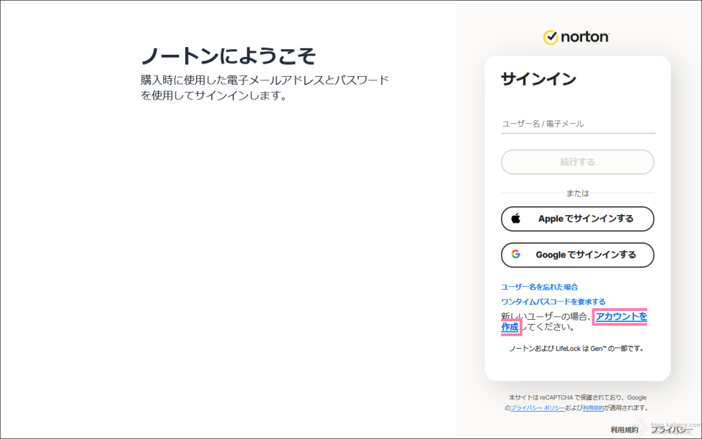 前のページで、ノートンサポート窓口のオペレータの方から新しいノートンアカウントを作成するように指示がありましたので、このページでは新しいノートンアカウントを作成する方法について紹介します。