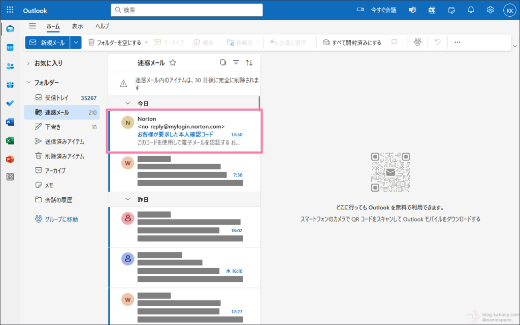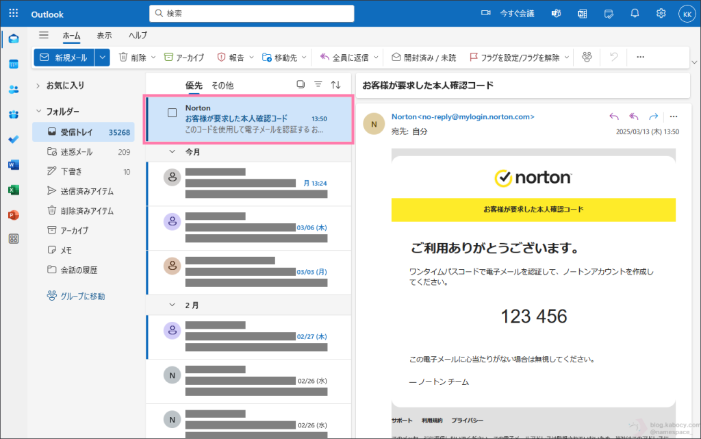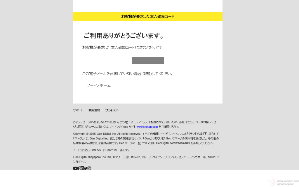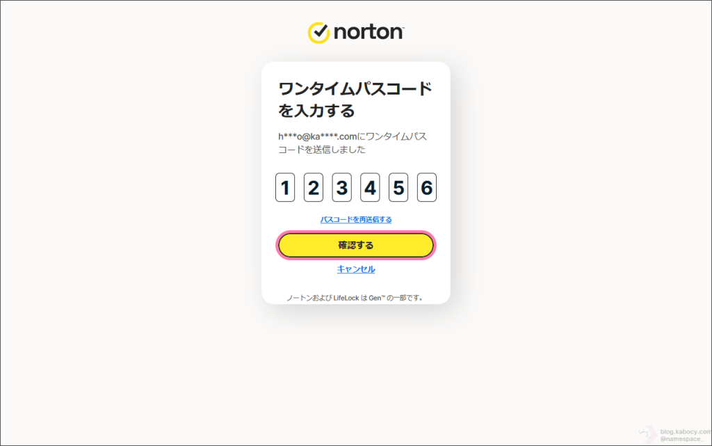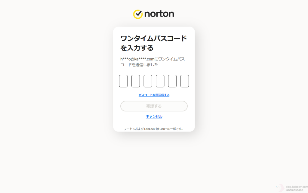 ▼ ワンタイムパスコードを入力するように求められたら、先ほど入力したメールアドレスの受信箱を開き、ノートンから送られてくるワンタイムパスコードを確認します。