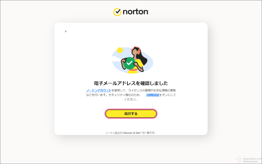 ▼ ノートンから送られてきたワンタイムパスコードを正しく入力できると「電子メールアドレスを確認しました。」と表示されますので「続行する」をクリックします。