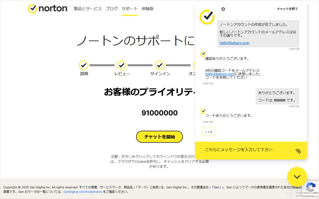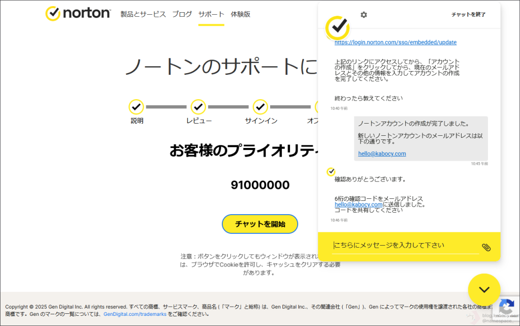では、新しいノートンアカウントが作成できた旨、ノートンサポートのオペレータの方に報告してみます。