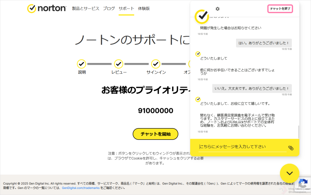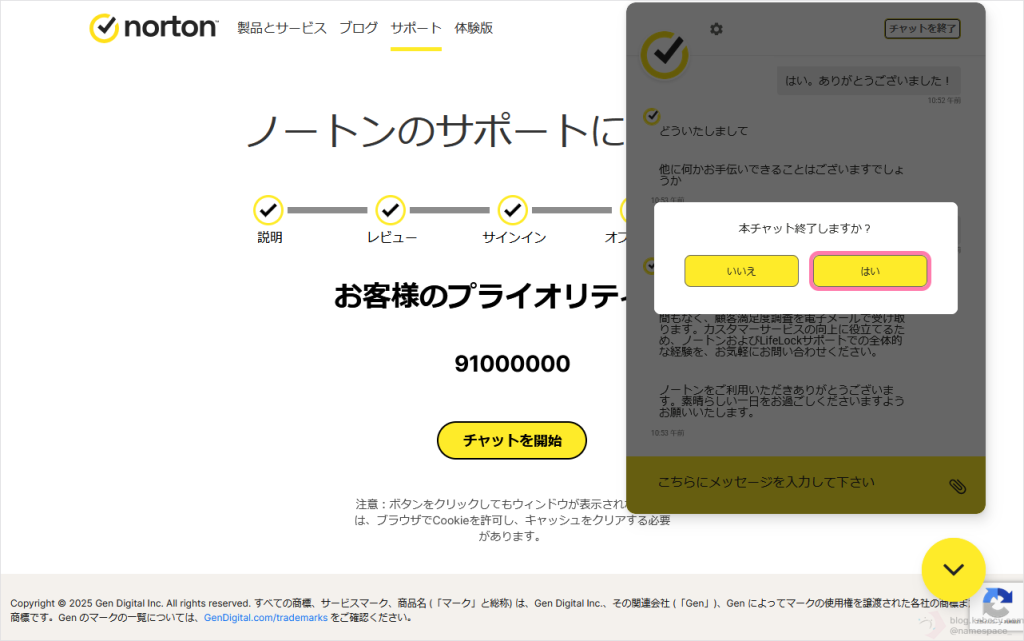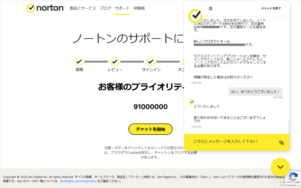 新しいノートンのプロダクトキーを控えたことを確認し、「チャットを終了」をクリックします。