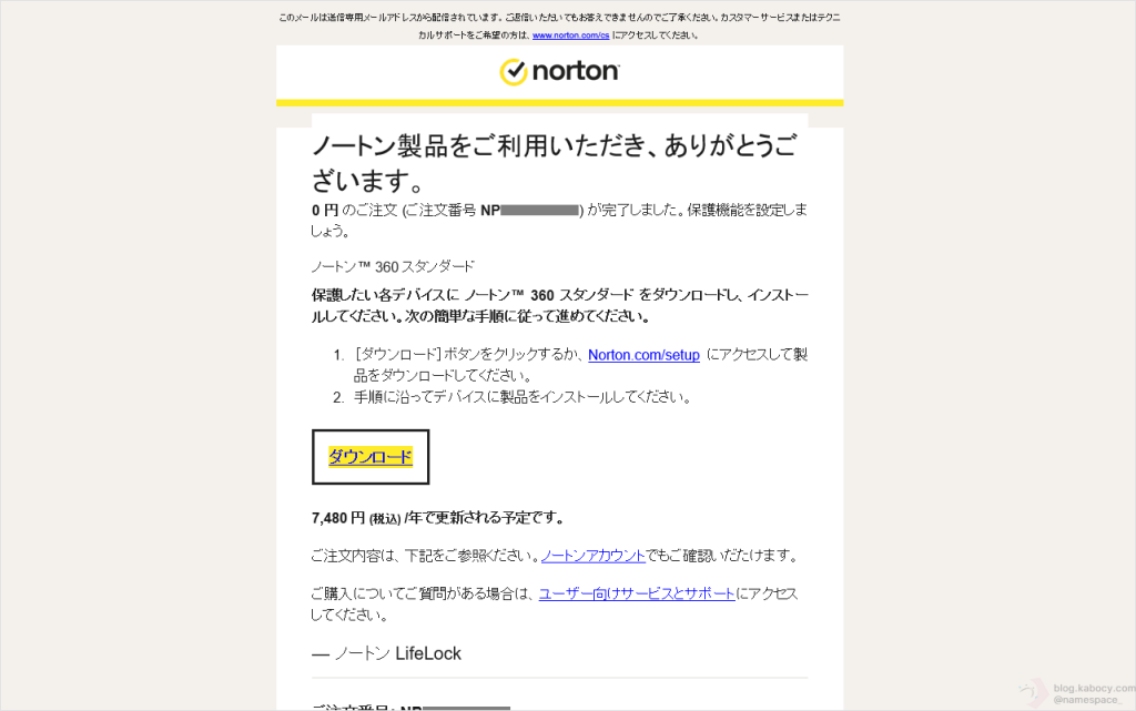 ▼ 操作が完了すると、「ノートン 注文 #NPnnnnnnnnnn 購入完了」というメッセージがノートンから送られてきます。この時、「0円のご注文」になっていることを確認しましょう。
