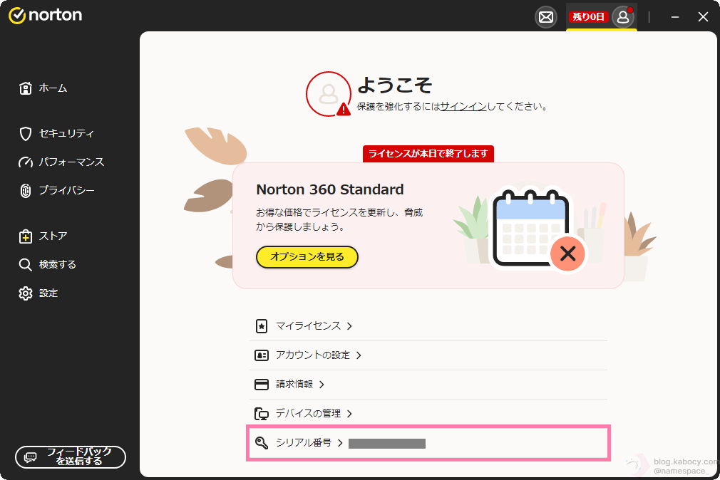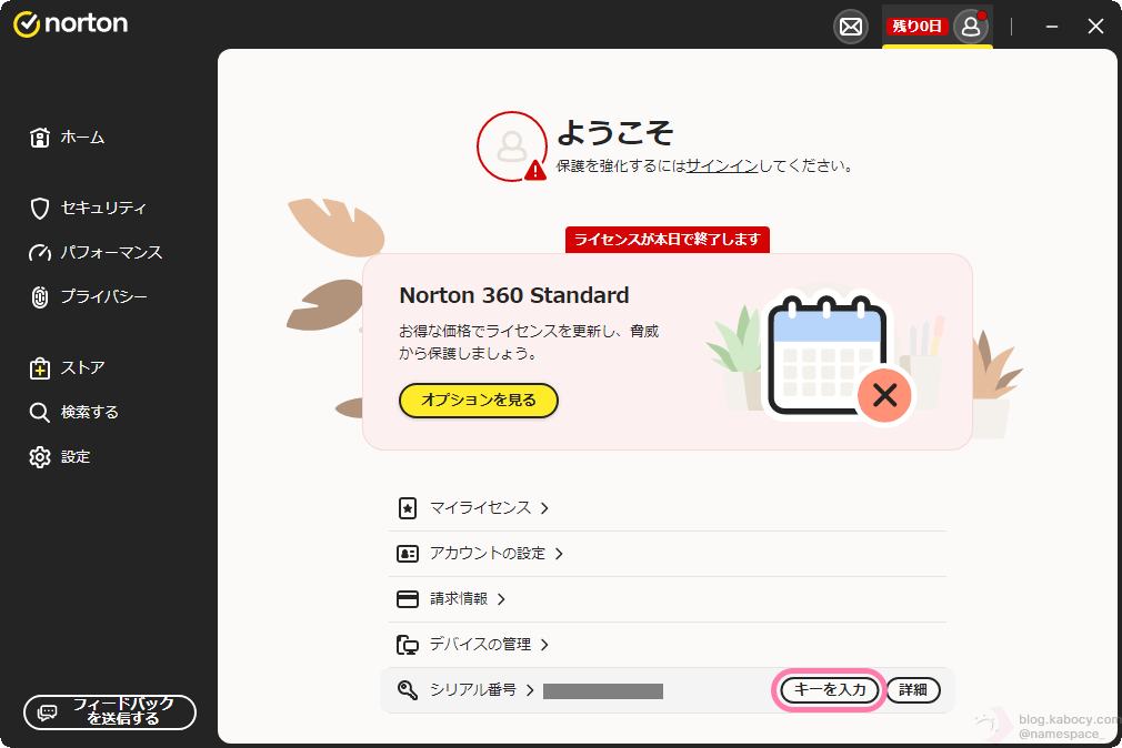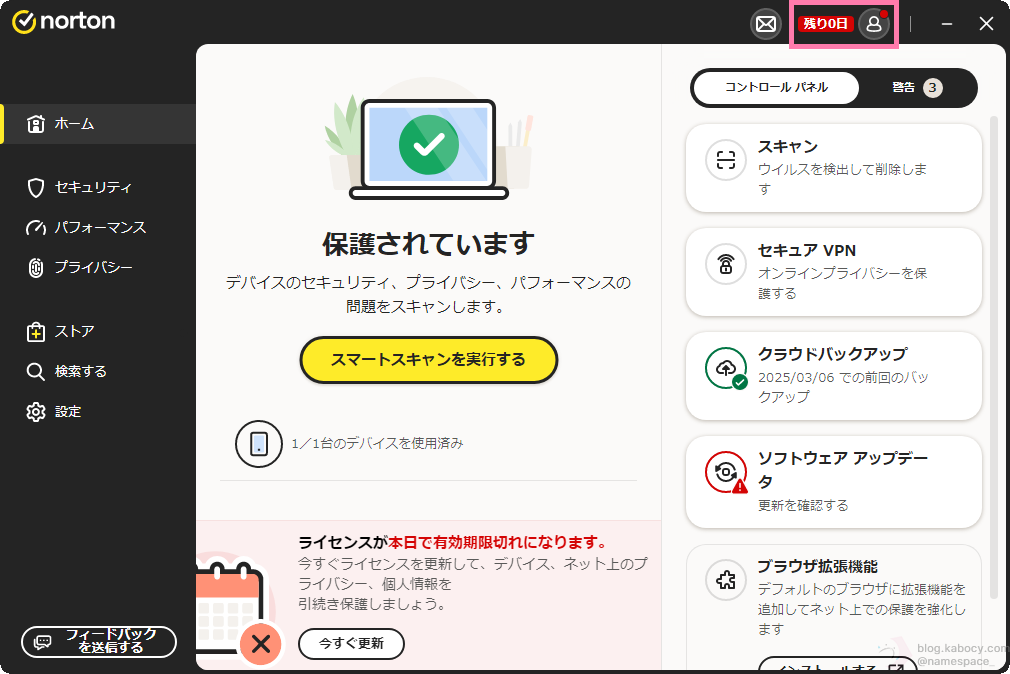 ノートンアカウント操作が完了すると、「残り0日」と表示されたうえで、「ライセンスが本日で有効期限切れになります。」と表示されるようになります。
