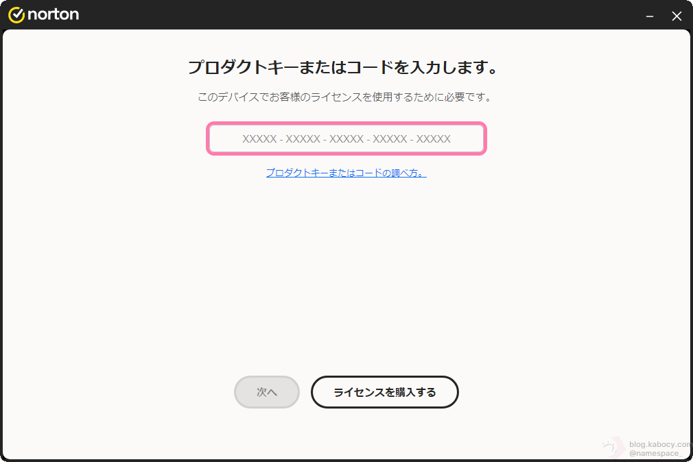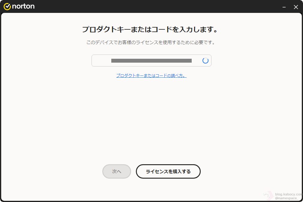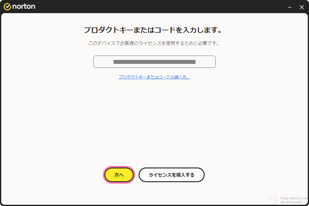 ▼ 先ほど控えたノートンのプロダクトキーを入力します。