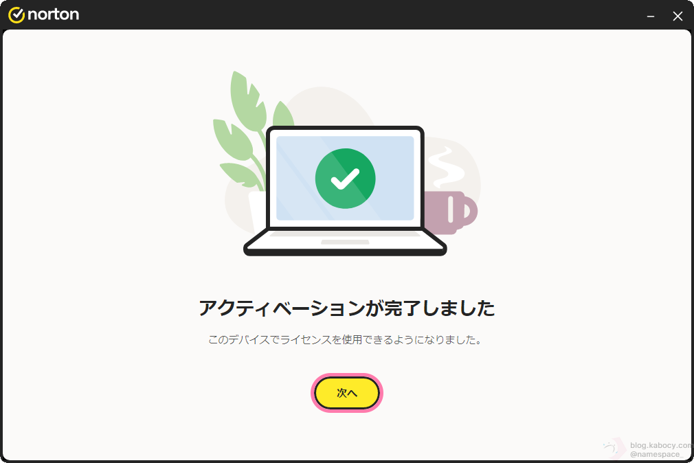 ▼ ノートンのライセンス認証が完了すると「アクティベーションが完了しました」と表示されます