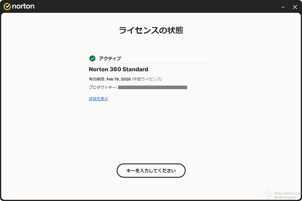 ▼ するとノートン製品のエディションと有効期限、入力したプロダクトキーが表示されます。