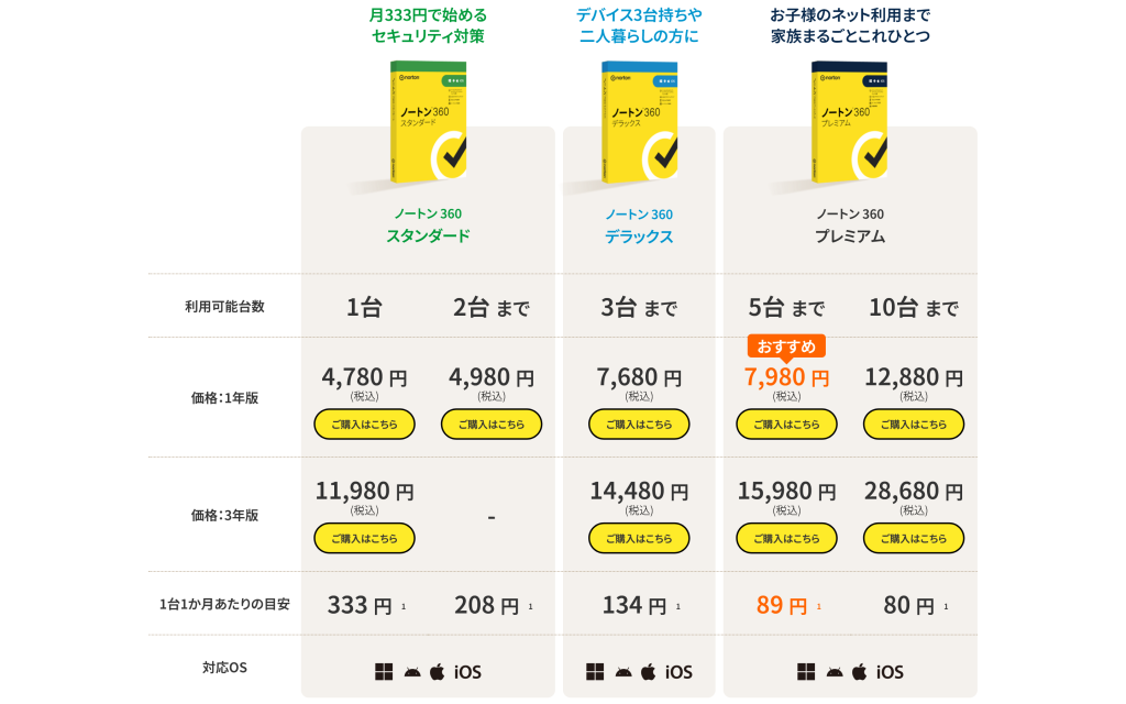 例えば、今回の例の「ノートン 360 スタンダード 1台」の場合、新規購入では1年版が4,780 円(2025年3月20日時点)ですが、翌年以降からは7,480 円で毎年更新となります。